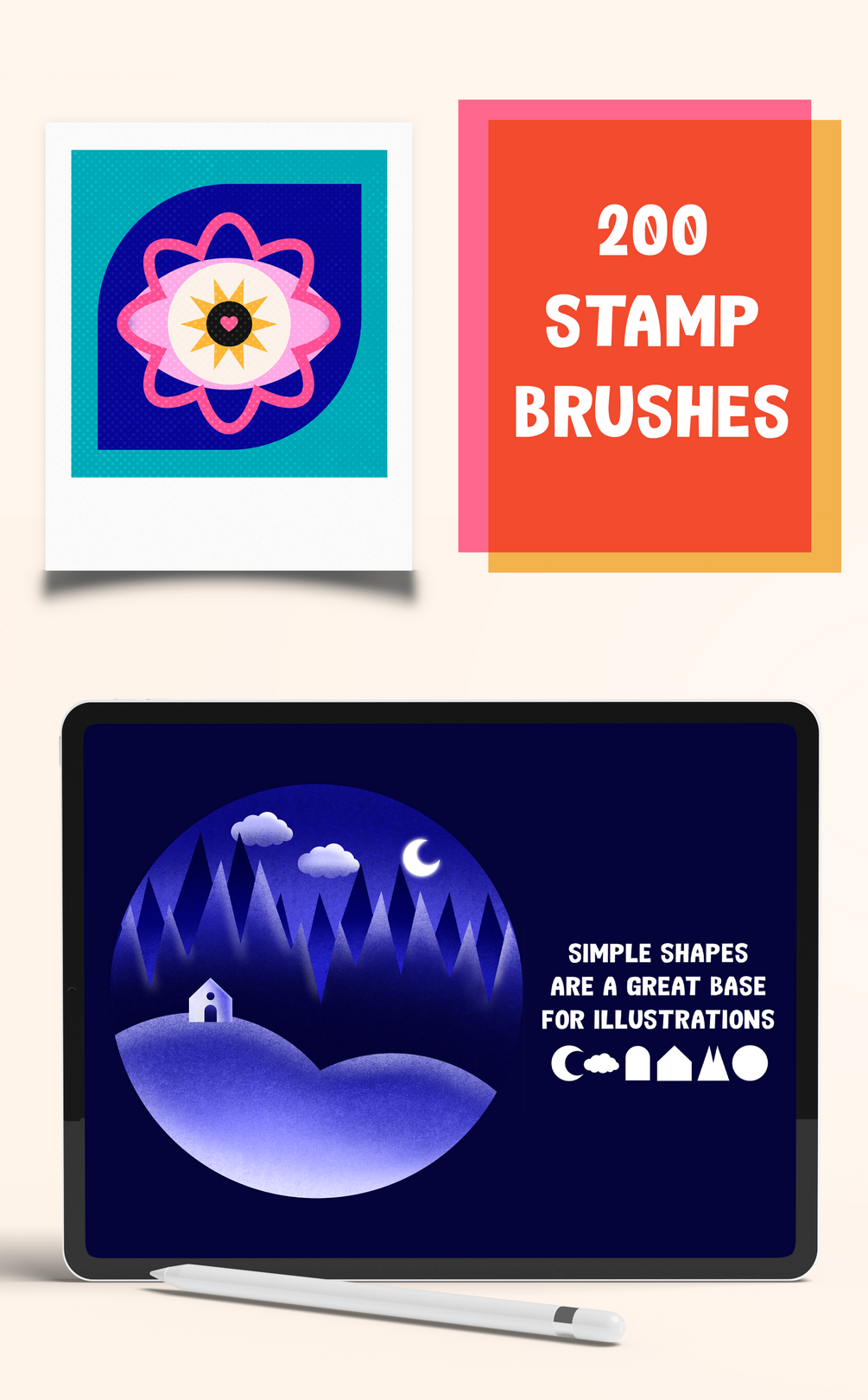 Collection of 200 shape stamps to ease up your workflow. Use these shapes for abstract art, patterns, logos, or use them as a base for all kinds of illustrations. Every shape has a Solid and Outline version.