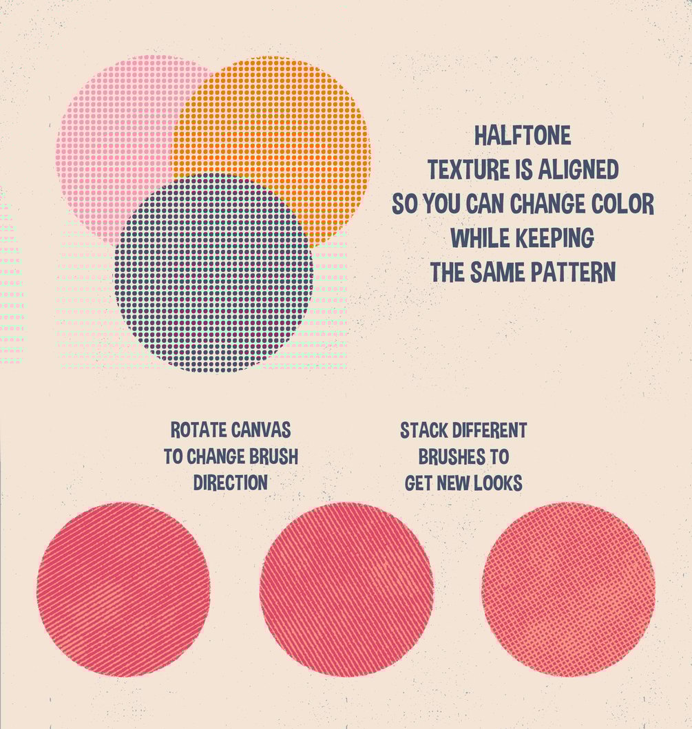 These brushes are oriented to screen so you can rotate your canvas to change your pattern direction. You can also stack and mix different textures with each other to create whole new halftone effects!