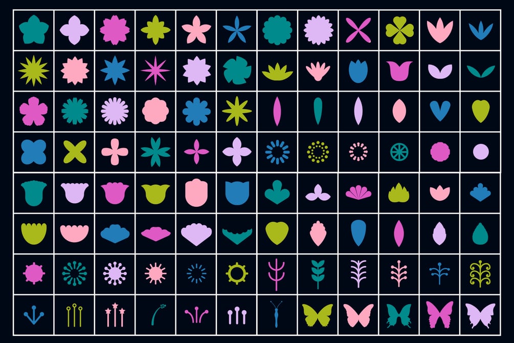 Collection of 125 simple and beautiful stamps. Create hundreds of flower combinations by mixing together different flower parts!