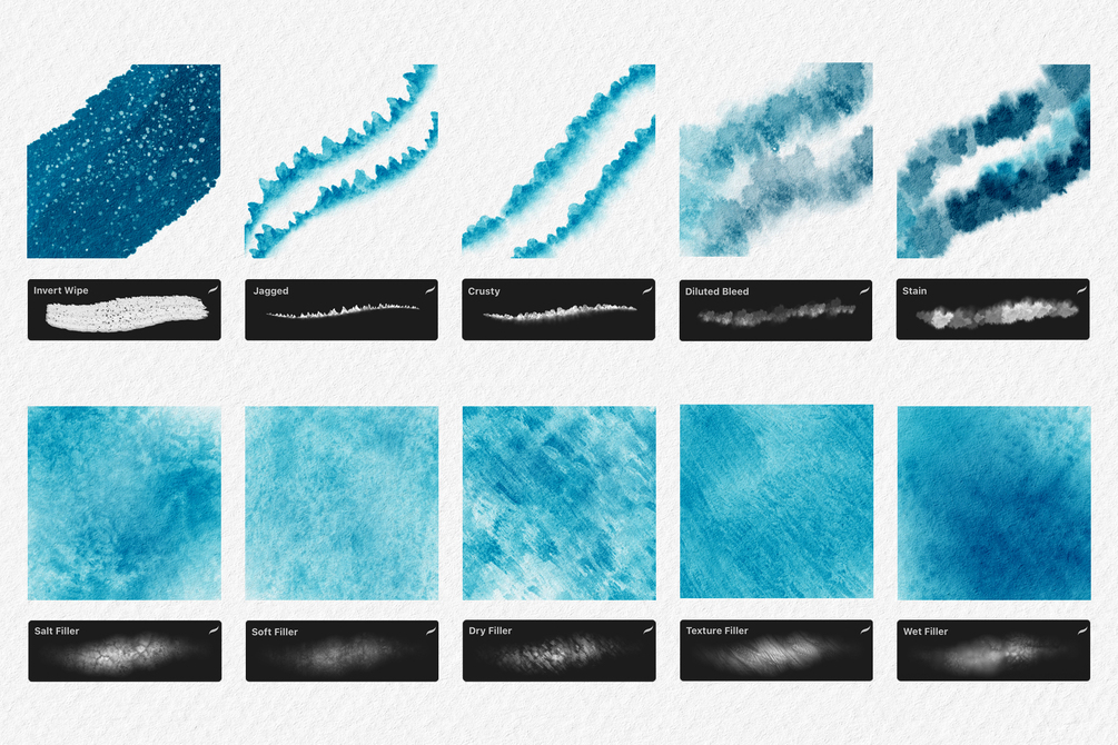 This pack was developed for making watercolor backgrounds. Inspired by beautiful water bleeds, watercolor splatters, and salty textures. Every brush has its own special touch. Layer brushes for organic watercolor look. Make abstract backgrounds and add watercolor texture to your art and lettering.